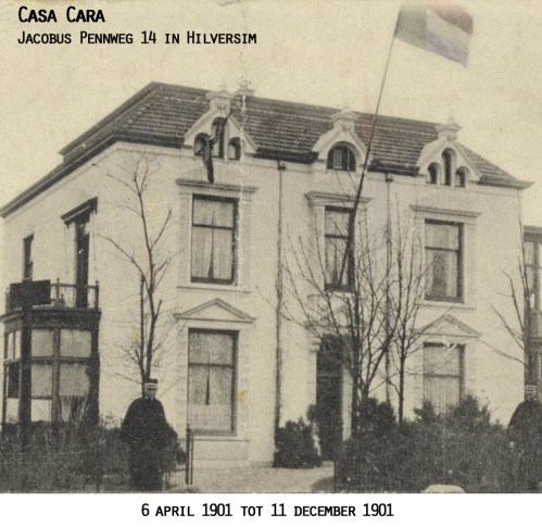 Kruger arrived and disembarked in Marseille in November 1900, where he lived in France until he moved to the Netherlands in 1901. He lived in hotel “De Nederlanden” (nowadays hotel “Les Pays Bas”) in central Utrecht for two months. Kruger moved to villa “Casa Cara” in the city of Hilversum in April 1901, where he stayed until December 1901. Meanwhile Kruger’s second wife Gezina du Plessis, who he had left in Pretoria because she was too ill to travel to Europe, died in July 1901.