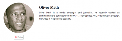 Meth has written for SA publications including Daily Maverick and Daily Vox. In his biography on the publication, he is transparent about having been a “communications consultant” on the CR17 campaign.