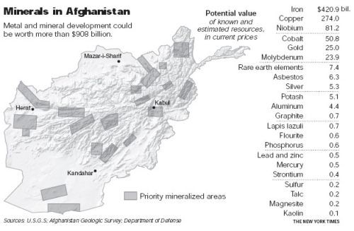 According to the New York Times, a mixed team of US military and geologists have discovered trillion-dollar mineral resources in Afghanistan. These would be enough to bring about radical changes in the Afghan economy and probably in the unfolding of the war itself. The reserves are of iron, copper, cobalt, gold, and metals used in industry, such as lithium, the existence of which was not known, are very large and include many minerals crucial for the development of modern industry, thus Afghanistan can be transformed into one of the most important mining centers in the world, according to US administration officials.